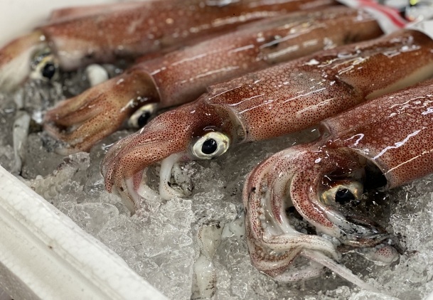 スルメイカ赤褐色で太め旨みが濃く歯ごたえあり加工・焼きに最適