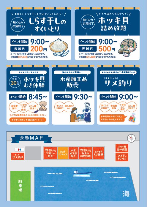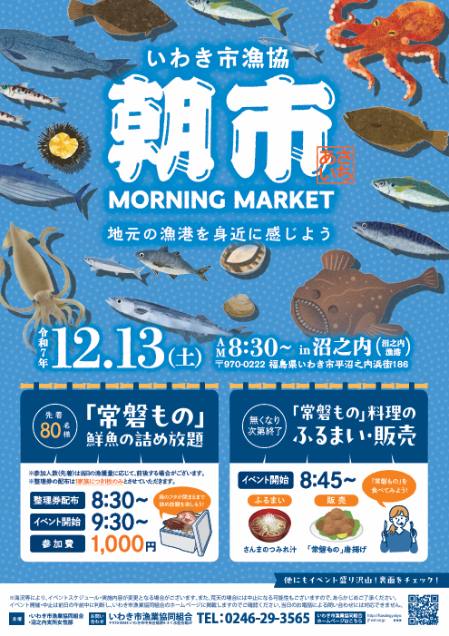 2025年12月8日 / 最終更新日時 : 2025年12月15日 yabukigyogyou イベント 🌊 沼ノ内漁港で朝市開催! いわき市漁業協同組合・沼之内支所女性部の主催により、沼ノ内漁港で朝市を開催します!! 新鮮な海の幸や港ならではの雰囲気を楽しめる朝市ですので、ぜひお越しください。 コメントを残す コメントをキャンセルメールアドレスが公開されることはありません。 ※ が付いている欄は必須項目ですコメント ※ 名前 ※ メール ※ サイト 次回のコメントで使用するためブラウザーに自分の名前、メールアドレス、サイトを保存する。