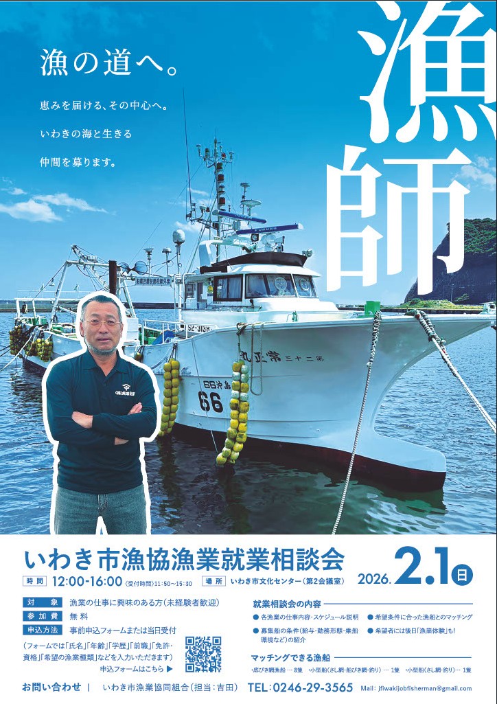 2026年1月9日 / 最終更新日時 : 2026年1月9日 yabukigyogyou お知らせ いわき市漁協漁業就業相談会のお知らせ! ぜひ仕事にご興味のある方は、いわき市漁業協同組合までお気軽にお問い合わせください。 コメントを残す コメントをキャンセルメールアドレスが公開されることはありません。 ※ が付いている欄は必須項目ですコメント ※ 名前 ※ メール ※ サイト 次回のコメントで使用するためブラウザーに自分の名前、メールアドレス、サイトを保存する。